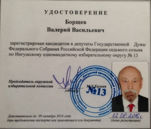 Правозащитник Валерий Борщев, член Московской Хельсинкской группы и лидер правозащитной фракции партии «Яблоко», зарегистрировался кандидатом в депутаты Государственной думы по ингушскому одномандатному округу. Об этом на своей странице в социальной сети сообщает глава ингушской правозащитной организации «Машр» Магомед Муцольгов.