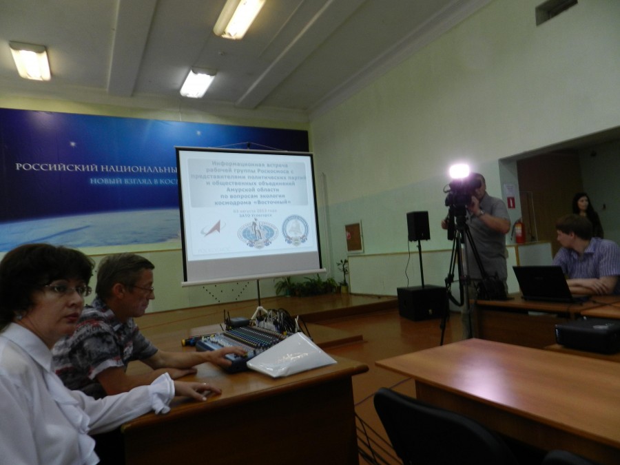 Встреча началась с ряда презентаций членов рабочей группы, целью которых было убедить присутствующих в безопасности технологий, предполагаемых для использования на космодроме. Из позитива – гости узнали, что на «Восточном» планируется установка оборудования по очистке или утилизации жидких и твердых отходов. Из негатива – не было информации о развитии событий в случае возникновения нештатных ситуаций. Покоробило то, что в выступлениях ряда амурских чиновников сквозило пренебрежение к обеспокоенности населения вопросами безопасности деятельности космодрома: «Население Амурской области можно разделить на две половины, одна часть здраво и с пониманием относится к будущему космодрому, а другая не особенно умная, вроде каких-нибудь школьных учителей биологии паникует… ».
