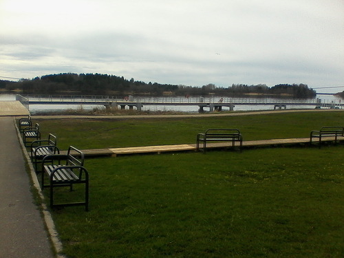 Вроде бы выглядит красиво, но вода скрывает тайну - глубина не достаточна, что бы приставали теплоходы с туристами. Произошло это опять же из-за того, что строили впопыхах и без проекта, отсыпали акваторию песчано-гравийной смесью из ближайшего карьера, вместо того что бы укрепить берега булыжником. Конструкции шаткие, настил левого первого пролета качается, и это когда мы ходили вдвоем, очень страшно представить, что будет, когда на нем скопятся люди!!!! Вообще по безопасности прибывающих очень много вопросов, но об этом не сейчас.