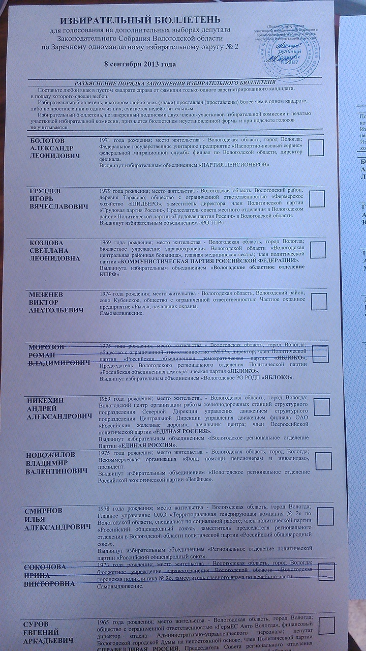 Начнем с того, что ТИК г. Вологды допустил нарушение закона и признал свою вину при получении от меня, как кандидата документов на регистрацию, в результате чего и действий «самых справедливых» судов я был снят с предвыборной гонки 4 сентября 2013 года судьей Пирожковым, оставившим решение областного суда в силе, но бюллетени перепечатывать не успевали, поэтому я был вычеркнут. Вот сам бюллетень: