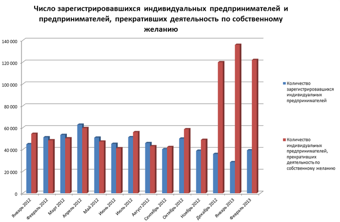 По данным Федеральной налоговой службы за декабрь-февраль легальный бизнес прекратило 274 тысячи человек. Вот показательная диаграмма, построенная на основе общедоступной статистики ФНС.