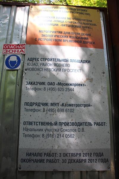 Местные жители провели лидера партии «ЯБЛОКО» и активистов до вентиляционного колодца, который вопреки требованиям строился не изнутри тоннеля, а снаружи, из-за чего рабочим пришлось вырубать часть леса. Изначально в проекте было запланировано метро глубокого залегания, однако затем в целях экономии средств станцию решили строить не так глубоко. Половина работ в Битцевском лесу ведется на особо охраняемой природной территории открытым способом, что недопустимо.