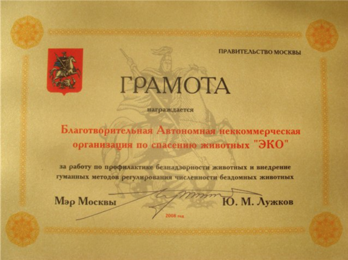 Ещё с 2008 она получает грамоты от мэрии за «внедрение гуманных методов» обращения с животными.