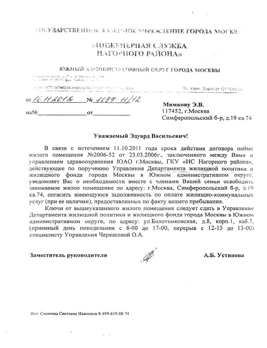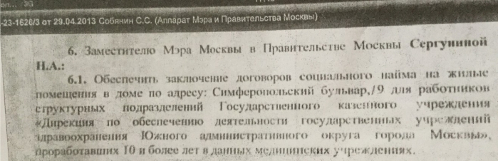 Собянин подписал распоряжения Правительства Москвы: № 534 - РП от 23.09.2014 года и № 661 - РП от 18.11.2014 года «О предоставлении жилой площади» жителям дома № 19, по Симферопольскому бульвару, города Москвы, согласно норме предоставления жилой площади в доме-новостройке по договорам социального найма жилых помещений от 26.09.2014 года на основании Распоряжения Правительства № 534 - РП от 23.09.2014 года.
