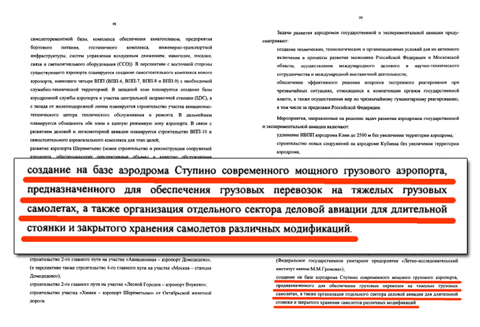 А накануне этого решения командой нового губернатора Московской области Сергея Шойгу были отклонены все прежние проекты территориального планирования Подмосковья, предусматривавшие строительство грузового аэропорта в Ступино.