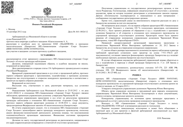 В апреле 2012 года Арбитражным судом Московской области было открыто дело А41-18026/2012 о признании компании-оператора по строительству грузового аэропорта НП «Аэронавт Спорт Холдинг» банкротом. Уже в сентябре 2012 года судом было принято решение о признании должника банкротом и об открытии конкурсного производства.