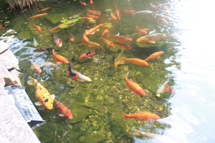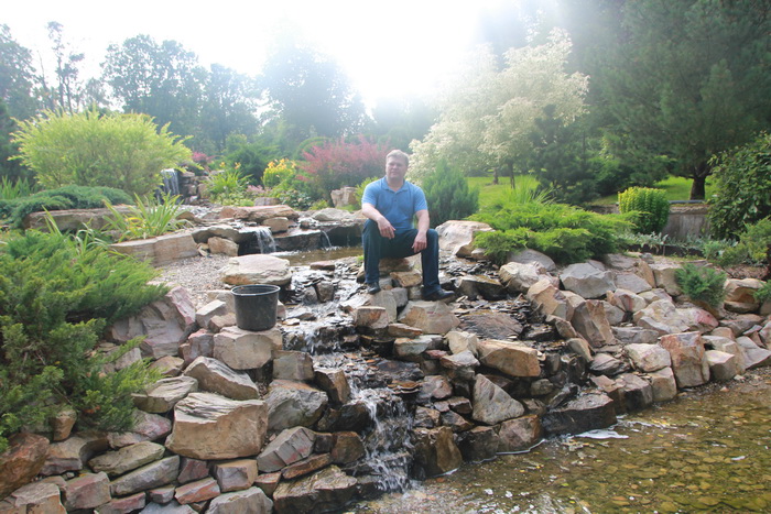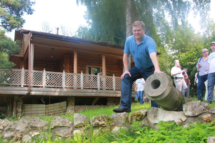 У бани разбиты искусственные пруды, берега которых выложены камнями и украшены декоративными каменными пушками: