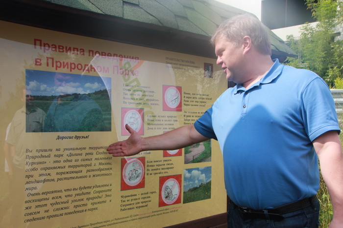 Этот информационный щит сообщает, что «природный парк «Долина реки Сходни в Куркино» - одна из самых маленьких природных территорий Москвы, при этом поражает разнообразием ландшафтов, растительного и животного мира»: