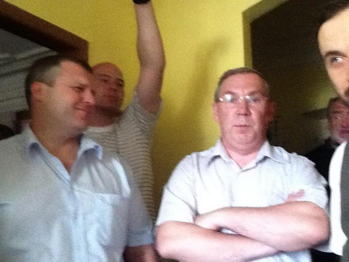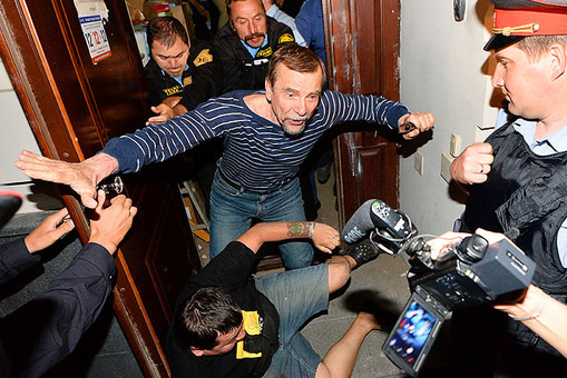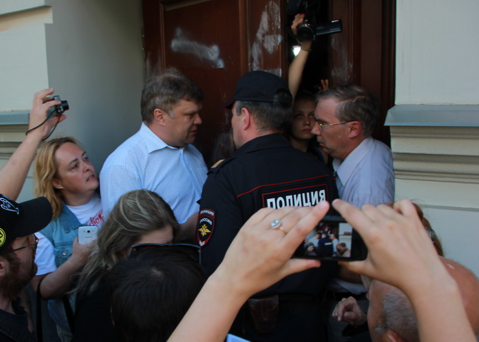 Неизвестный старшина и генерал-майор полиции Бирин своими телами защищают от меня вход в захваченный ими офис правозащитников. В момент их замешательства мне все-таки удается прорваться внутрь.