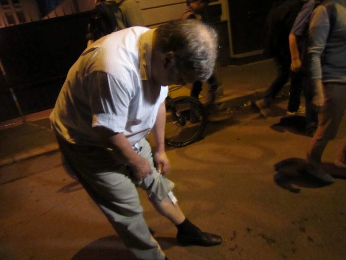 Меня под конец горилла пихнула в спину вниз по лестнице – с явным расчетом разбить голову. Сгруппировался и упал на локоть (болит до сих пор). Вторая рана во время полета с лестницы образовалась у меня на ноге: