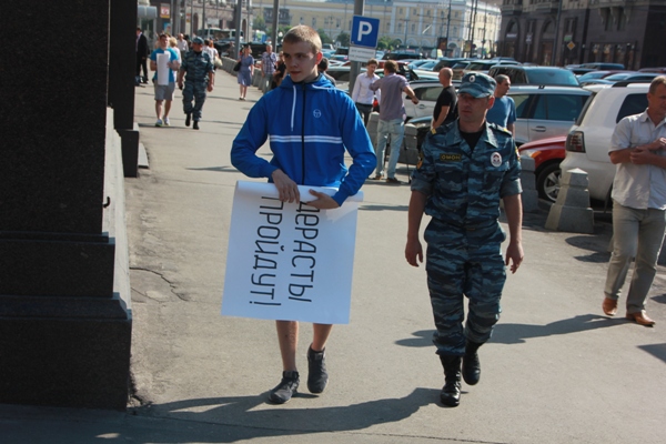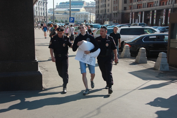 Кроме протестующих против закона об оскорблении чувств верующих сегодня у Госдумы несколько человек выступили против нетрадиционных сексуальных отношений. Молодые люди держали в руках плакаты с оскорбительными надписями. Несмотря на то, что протестующие нарушали закон о митингах, находясь друг от друга на расстоянии явно меньшем, чем 50 метров, полицейские приняли меры только после замечания активистов «ЯБЛОКА».Тогда гомофобов попросили разойтись.