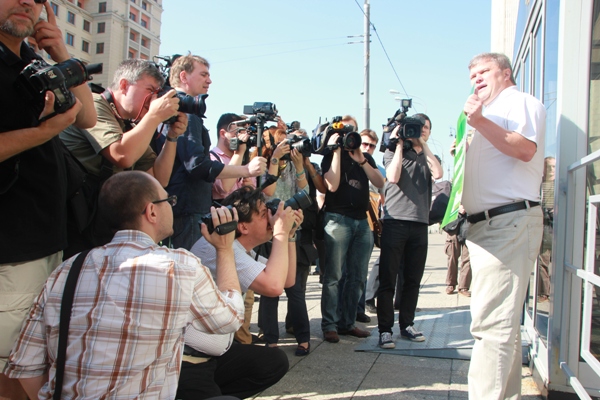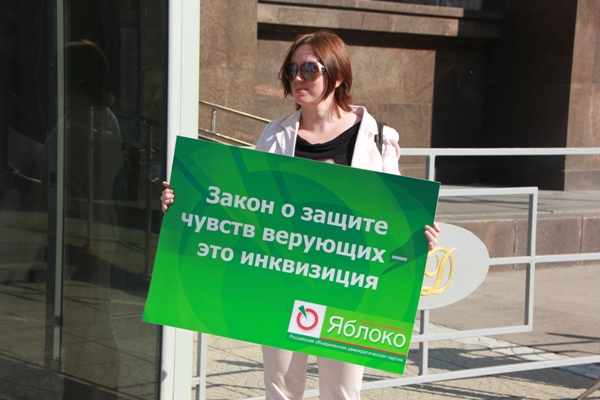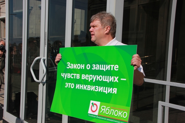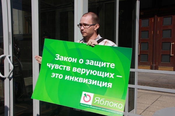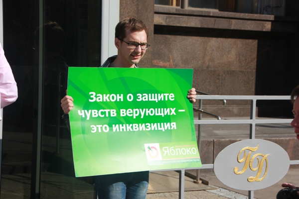 Сегодня у главного входа в Госдуму активисты партии «ЯБЛОКО» во главе с ее лидером Сергеем Митрохиным провели серию одиночных пикетов против законопроекта о защите религиозных чувств верующих, включенного на рассмотрение во втором и третьем чтении в повестку заседания Государственной думы.
