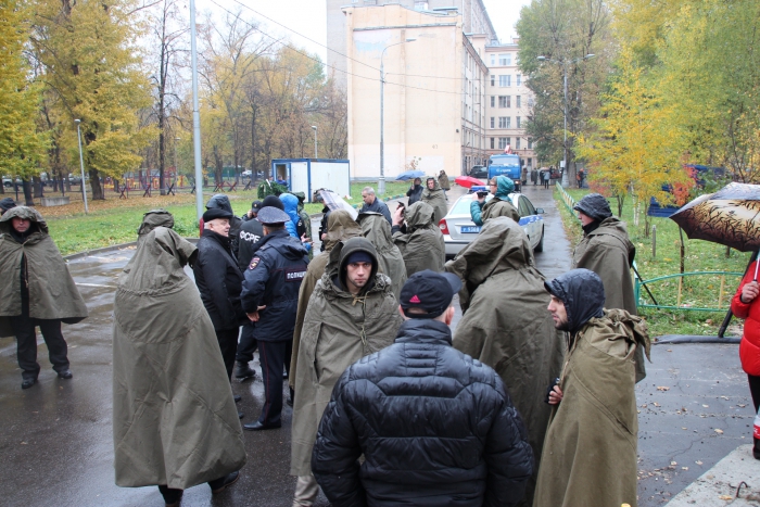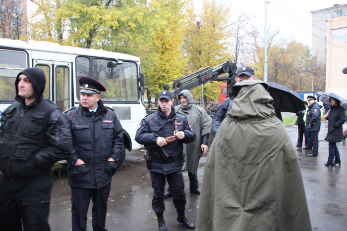 Прибыв на место с двумя журналистами – сотрудниками пресс-службы ЯБЛОКА, мы обнаружили, что около 50 человек в черной форме либо армейских зеленых бушлатах, больше похожих на спецподразделение по антитеррору, оцепили проезжую часть между несколькими домами и не пускают жильцов домов внутрь огороженного квадрата.