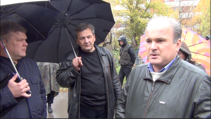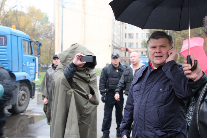 За всем происходящим на большом удалении от места событий наблюдали сотрудники управы в деловых костюмах, которые прятались от людей то за строительной техникой, то за дверьми магазина неподалеку.