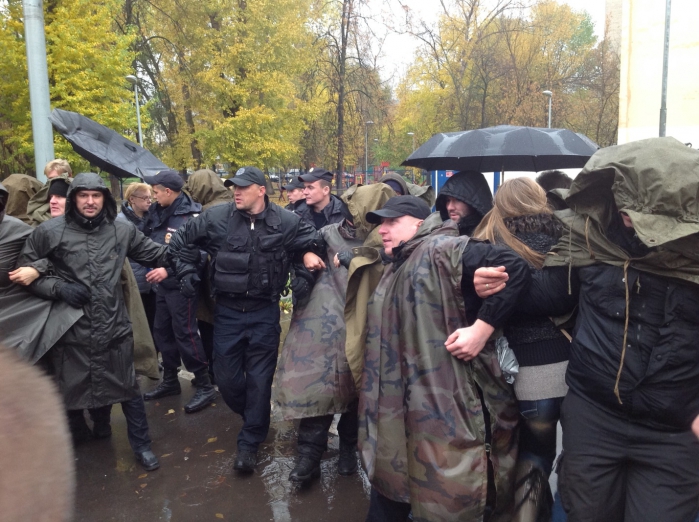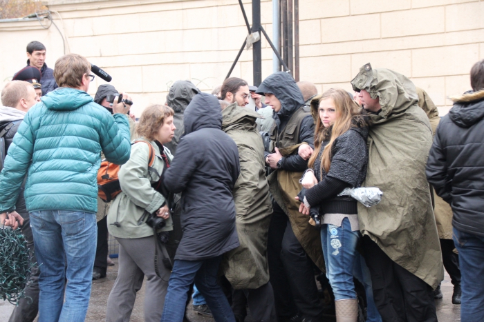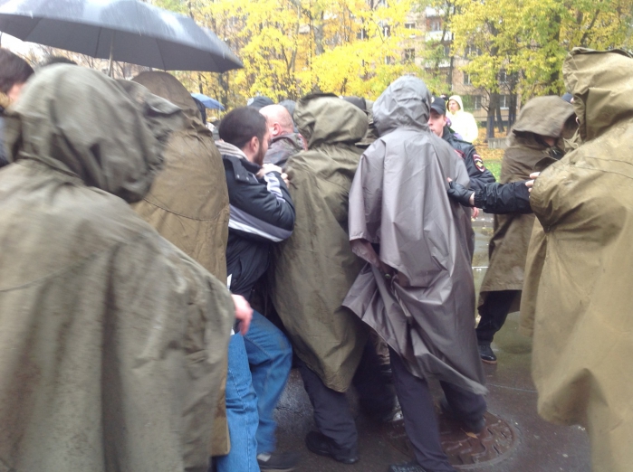 Однако уже спустя пару минут люди в черной форме стали пытаться закручивать руки журналисту «ЯБЛОКА» Дмитрию Флорину, пытаясь прервать его съемку. Придя ему на помощь, я сам подвергся нападению.