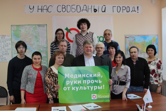 В центре - Сергей Митрохин, Софья Русова и Александра НалобинаСергей Митрохин рассказал о московской акции у Министерства культуры РФ и главном требовании "ЯБЛОКА" - отправить Владимира Мединского в отставку. Представители реготделения поддержали это требование.
