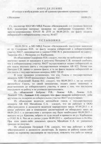 Вот сегодня получил ответ из полиции на мою жалобу по поводу подвоза людей на маршрутках Шадова. Предлагаю и вам насладиться столь замечательным ответом. Послесловие к нему я напишу чуть попозже и выложу, пусть и плохую, видеозапись той ситуации, где показана и агитка внутри автобуса, и что говорит сам шофер (в отличие от версии следователя шофер говорил, что приехал на обед в соседний дом, правда, ездит он без документов, поэтому сотрудникам полиции не смог предъявить паспорт с пропиской), да и время той ситуации — была половина двенадцатого дня (жалоба написана в 12:05, принята в полиции 12:30, а признаются, что возили с 8:00). Самое приятное, что никто не отрицает, что возили к школе голосовать. В общем, читайте и наслаждайтесь логикой и мыслью! Мисс Марпл отдыхает ...