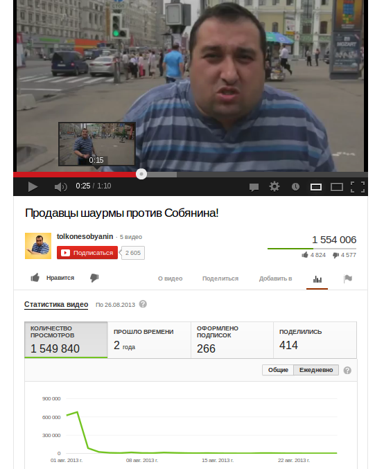 Ролик "продавцы шаурмы против Собянина" был размещен 1 августа. 1 августа он получил более 600 000 просмотров, 2 августа более 700 000 просмотров, 3 августа – около 100 000 просмотров, а за период с 4 по 26 августа – менее 200 000 просмотров.