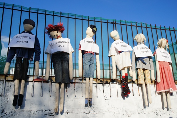 За порядком следила полиция, у места проведения митинга дежурили три автозака. Шесть манекенов, символизирующих висельников, встречали гостей митинга у входа. На табличках были надписи: «радость жизни», «спокойный сон», «тишина», «березовая роща», «здоровье детей», «чистый воздух» — всего этого местные жители могут лишиться, если стройка будет доведена до конца.