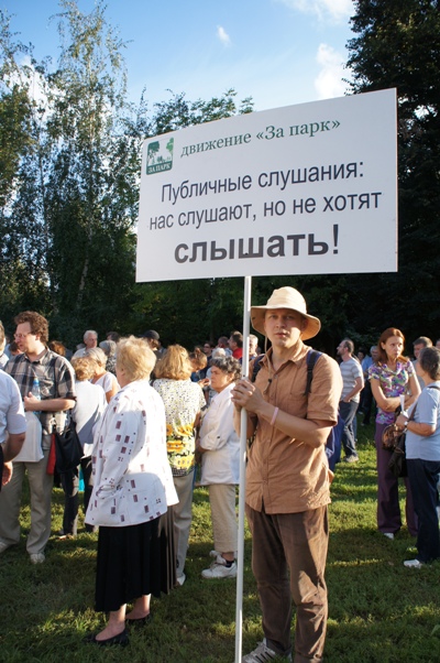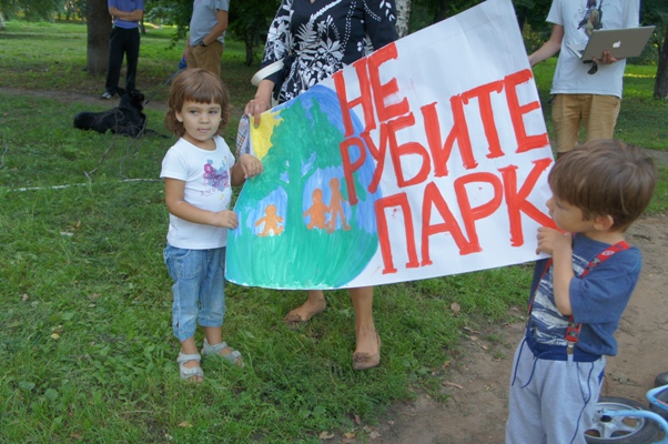 Не менее красноречивы были и плакаты митингующих, которые гласили: «Почему никто не спросил жителей района? Где публичные слушания?», «Бизнес-центр в 45 этажей — это и есть «общественный спортивный объект»?», «Зелень — в парки и скверы, а не в карманы к застройщикам!».