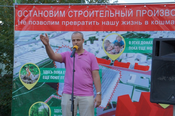 Мероприятие открыл своим выступлением Олег Ларин: «Нам врут про то, что здесь строится стадион. Действительно, по генеральному плану, по постановлению правительства Москвы, по назначению земельных участков здесь должен находиться футбольный стадион ЦСКА и точка. Но это сделано исключительно для того, чтобы прикрыть ту стройку, которая сейчас ведется — здесь строится офисный центр, площадь которого в несколько раз больше, чем спортивная площадь стадиона ЦСКА. Все это сделано с единственной целью: закомуфлировать реальное назначения участка, для того, чтобы не проводить публичные слушания, значит, не слышать наши с вами мнения». Он сообщил собравшимся, что и.о. заместителя мэра Москвы Марат Хуснуллин сказал, что раз стройка началась, ее уже нельзя остановить. Ларин подчеркнул, что от жителей скрывали процесс согласования этого проекта. На все запросы инициативной группы в Москомархитектуру, Департамент природопользования, Департамент культурного наследия поступал один и тот же ответ: проект на согласование не поступал, нет никаких актуальных документов на строительство. «Когда же мы вышли на пикет в апреле против незаконного на тот момент строительства, фактически в тот же день власти выдали официальное разрешение на строительство объекта. Только после этого мы получили февральское заключение экспертизы, в котором были указаны и согласование всех перечисленных выше структур, и выписано ГПЗУ, и порубочный билет, и информация о расширении до шести полос 3-й Песчаной улицы». Олег Ларин призвал местных жителей объединить все усилия, чтобы остановить стройку.