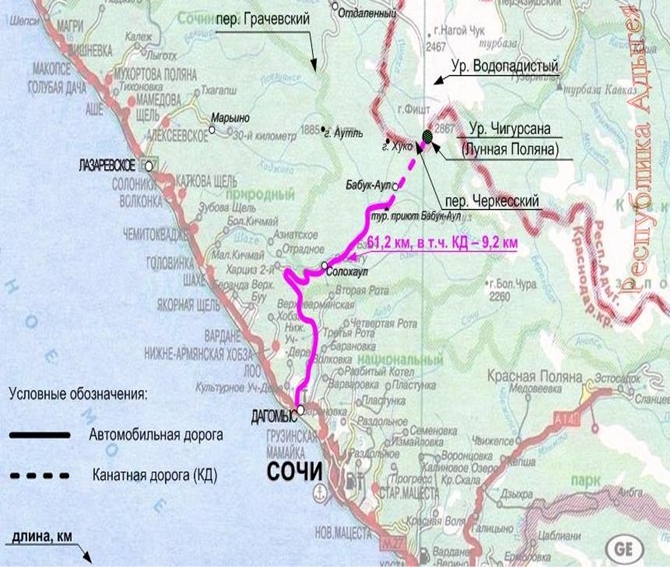Дорога стоимостью 1 млрд. 250 тыс. рублей и протяженностью около 20 км дойдет до кордона Бабук-Аул, откуда на «Лунную Поляну» планировали доставлять президентское тело с помощью самой длинной в мире канатной дороги, стоимость которой пока неизвестна.