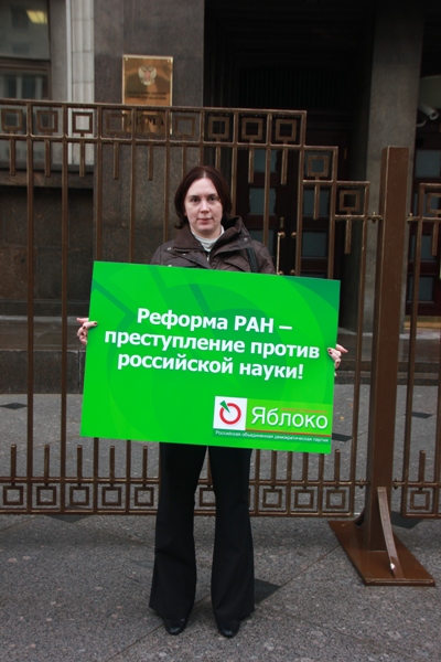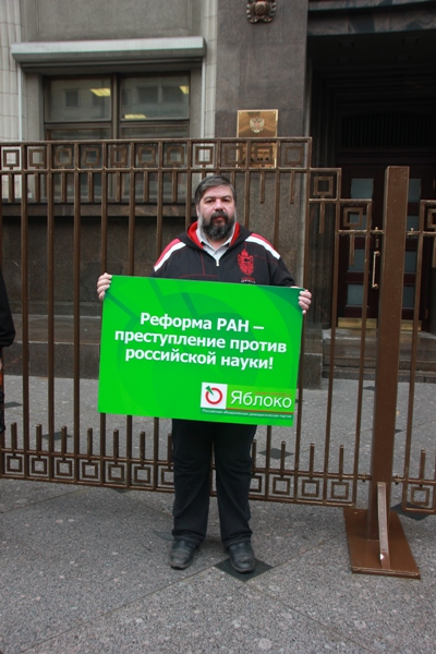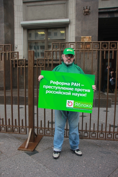 Сегодня, 17 сентября, активисты партии «ЯБЛОКО» – старший научный сотрудник Института водных проблем РАН Юрий Медовар и муниципальный депутат Григорий Семенов – провели одиночные пикеты у здания Госдумы против законопроекта о реформе РАН.