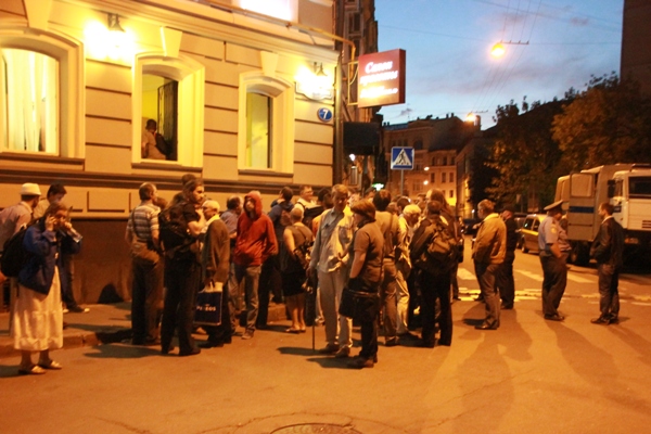 «Внезапно очень быстро, с огромной скоростью, ворвалась группа ОМОНа и стала хватать людей, — вспоминает Митрохин, находившийся внутри помещения. – Стаскивали людей с подоконников, с нарочитой жестокостью бросали об пол, бить стали, правда удары наносили профессиональные, без последствий: меня по шее ударили. На моих глазах эфэсбэшники, которые руководили операцией, тоже били людей. Огромный двухметровый верзила из ОМОНа скинул меня с лестницы — специально, чтобы я упал. У меня крупная ссадина теперь – одна на ноге, другая на локте».