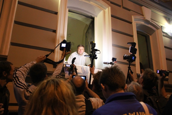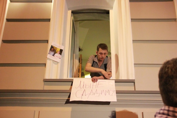 Оставшийся на улице омбудсмен Лукин, как видно на , был вынужден вести переговоры с правозащитниками, высунувшимися по пояс из окна.