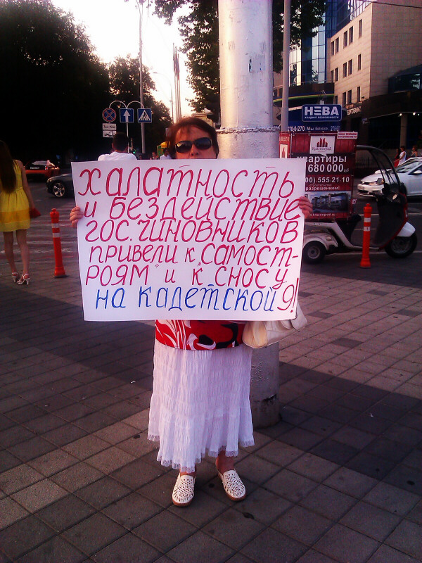 Вчера, 1 июля, более тридцати человек из числа обманутых дольщиков снесённых домов по улице Кадетской, 9 в Краснодаре пришли выразить свой протест против произвола властей. Организатором пикета выступило региональное отделение партии «Коммунисты России». В качестве участников пикета были и активисты краснодарского «ЯБЛОКА». Несмотря на фундаментальную разницу в идеологиях, члены партии «ЯБЛОКО» не смогли остаться в стороне от беды собственников разрушенного дома, ставших жертвами мошенников, и не нашедших защиты со стороны властей.