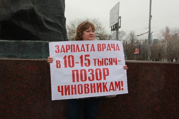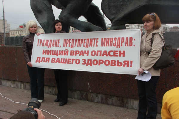 Медработники требуют выплаты задержанной заработной платы, пересмотра системы оплаты труда врачей, в том числе - повышения базовой части зарплаты, снижения норматива по количеству пациентов на участке и отмены штрафных санкций, введенных с 1 января 2013 года.