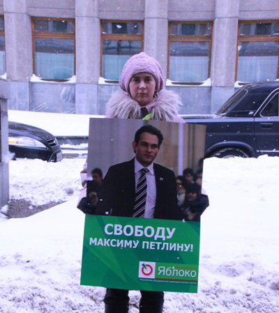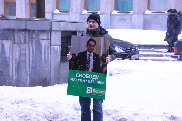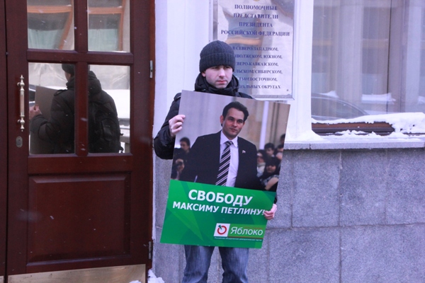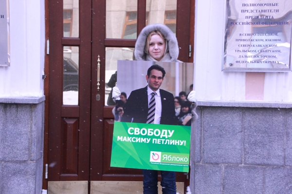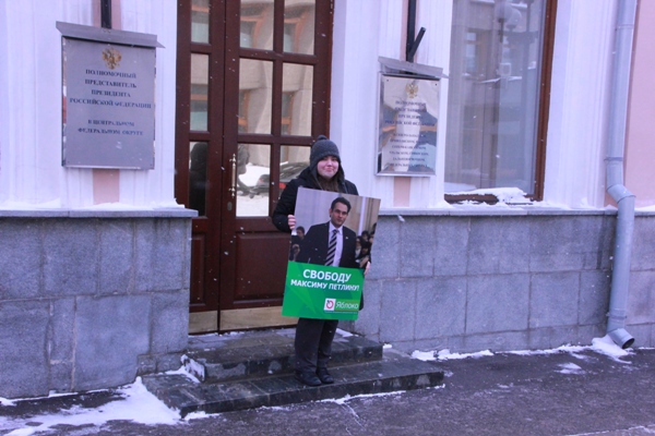 Активисты московского «Молодежного Яблока» провели одиночные пикеты в поддержку лидера свердловского отделения партии политзаключенного Максима Петлина. Пикет прошел у здания офиса Полномочного представителя Президента в Уральском федеральном округе.
