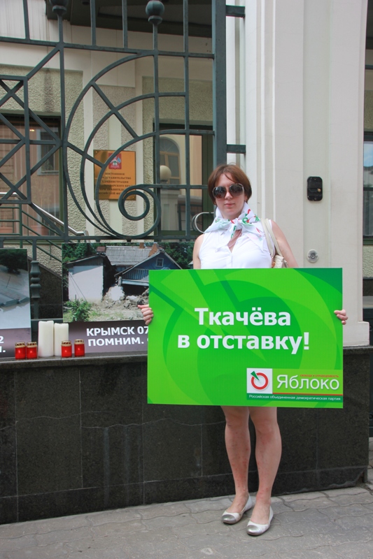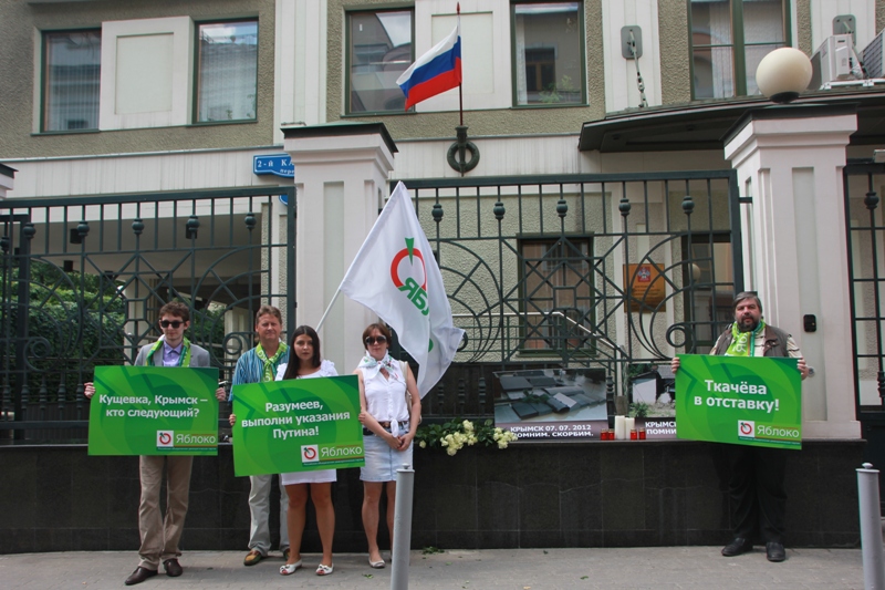 Сегодня, год спустя после трагедии в Крымске, активисты и сторонники партии «ЯБЛОКО» пикетировали постоянное представительство администрации Краснодарского края с требованием отправить в отставку губернатора края Александра Ткачева и выплатить положенные по закону компенсации пострадавшим.