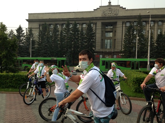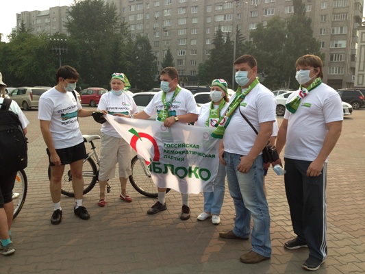 В Красноярске состоялся первый «яблочный» велопробег под лозунгом «За чистый воздух! За чистый город!». Из-за плотного смога, который уже несколько дней окутывает миллионный сибирский город, участники акции – члены партии «ЯБЛОКО» и ее сторонники – преодолели весь маршрут, не снимая марлевых повязок.
