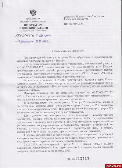 В связи с этим депутат просит прокуратуру Псковской области ускорить подачу в Арбитражный суд Псковской области заявления о признании разрешения на строительство административного здания № RU 60302000-15 от 31.05.2013 недействительным; ходатайствовать перед судом о принятии обеспечительных мер по иску в виде запрещения застройщику и подрядчику на период до вступления решения суда в законную силу производить любые работы на строительной площадке; а также внести в исковое заявление требование о демонтаже незаконно возведенных элементов здания за счет застройщика.