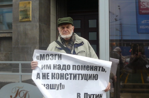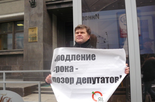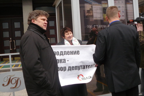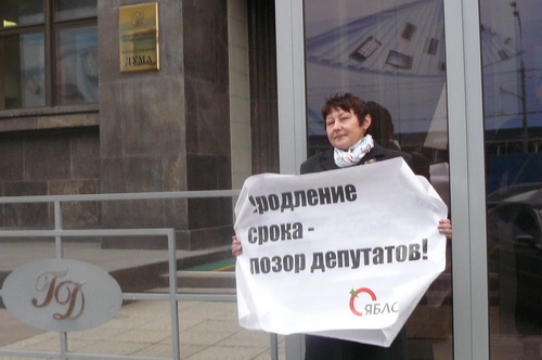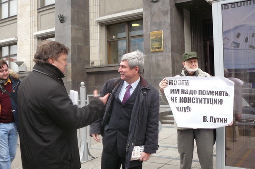 Лидер «ЯБЛОКА Сергей Митрохин, член Политического комитета, эколог Алексей Яблоков и секретарь Политкомитета партии Галина Михалева каждые десять минут сменяли друг друга, держа в руках плакаты «Мозги им надо поменять, а не Конституцию нашу. В. Путин» и «Продление срока – позор депутатов».