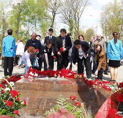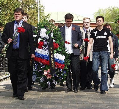 Члены московской организации «ЯБЛОКА» и молодежной организации во главе с собрались во вторник, чтобы почтить память павших в войне. «Яблочники» образовали колонну возле входа на мемориал, прошли к памятнику и каждый возложил к его подножию две красные гвоздики в память о советских гражданах, погибших при отражении фашистской агрессии против Советского Союза и освобождении Европы.