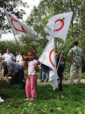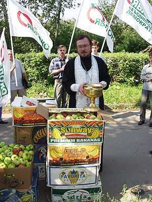 Местные жители активно присоединялись к митингующим и еще активнее угощались освященными яблоками. Даже сотрудники милиции, следящие за порядком, не удержались и забрали себе ящик с яблоками - "угостить все отделение".