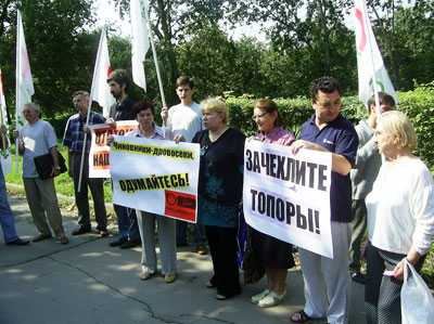 "Яблочники" держали плакаты "Чиновники-дровосеки, одумайтесь!" и "Зачехлите топоры!". Помимо этого, они принесли с собой 10 ящиков с яблоками, которые уже на месте были освящены отцом Александром из калитниковского Храма иконы Божией Матери "Всех Скорбящих Радость".