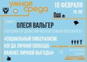// Анонс,Сегодня10 февраля в рамках проекта Умная среда пройдет лекция Олеси Вальгер, члена партии ЯБЛОКО, координатора движения «Искалеченный Новосибирск», преподавателя НГПУ. Тема лекции:«Социальный либерализм. Когда личная свобода важнее личной выгоды». Подробнее