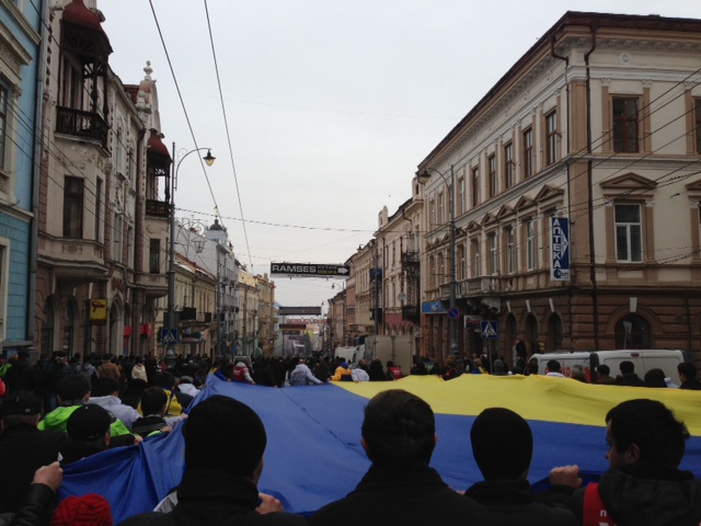 В суботу, 30 березня, на марш в рамках загальнонаціональної акції протесту «Вставай, Україно!» в Чернівцях зібралися близько 7 тисяч жителів області, люди продовжують підходити. Учасники акції тримають національні стяги, прапори опозиційних сил, плакати «За Україну, за її долю, за честь і волю, за народ!», «Україні волю! Юлі волю!», «За достойну пенсію!», «За справедливу зарплату!», «Роботу для кожного!», «2 квітня відродіть місцеве самоврядування», «Чернівцям потрібен мер», «Папієва у відставку!».