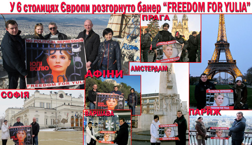 Активісти Київської міської партійної організації «Батьківщина» провели за кордоном шість акцій на підтримку екс-прем’єра Юлії Тимошенко. Впродовж новорічних свят банер «FreedomforYulia» (Свободу для Юлі), було розгорнуто в Нідерландах (Амстердам), Франції (Париж), Польщі (Варшава), Чехії (Прага), Греції (Афіни) та Болгарії (Софія).