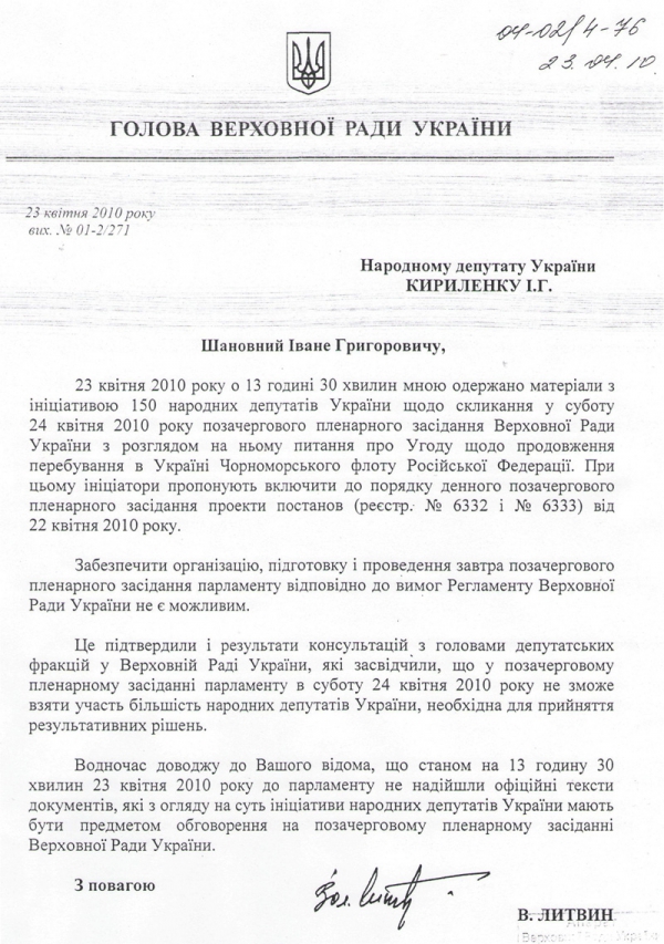 Зрив позачергового засідання Верховної Ради, яке мало відбутись 24 квітня, – це грубе порушення закону про регламент та конституційних прав народних депутатів скликати позачергове засідання парламенту. Про це заявив Перший заступник Голови фракції БЮТ Андрій Кожем’якін. Він повідомив, що 22 квітня було зібрано і подано до відповідних підрозділів Апарату Верховної Ради 155 підписів народних депутатів з вимогою провести позачергове засідання парламенту. «Тобто усі норми закону про регламент були дотримані, і позачергове засідання повинно було відбутись 24 квітня цього року», - наголосив Андрій Кожем’якін. «Виглядають більш ніж дивними сумніви працівників апарату парламенту щодо легітимності підписів 10 народних депутатів України. І це при тому, що під час під час процедури збору підписів були присутні засоби масової інформації і усі могли переконатися, що народні депутати особисто ставили свої підписи під вимогою провести позачергове засідання», - підкреслив народний депутат. На переконання Андрія Кожем’якіна, є неприпустимим, коли через недбалість працівників апарату Верховної Ради або інші, незрозумілі причини, підписи народних депутатів реєструються з одноденним запізненням, внаслідок чого відбувається зрив позачергового засідання парламенту. «В такому випадку, наголосив Андрій Кожем’якін, виникають питання до Голови Верховної Ради України Володимира Литвина, що власне відбувається у апараті Верховній Раді України, і хто повинен нести відповідальність за грубі порушення конституційних прав народних обранців вирішувати нагальні питання державної ваги?!», - сказав він. Наводимо лист Литвина з відмовою у проведенні позачергового засідання: