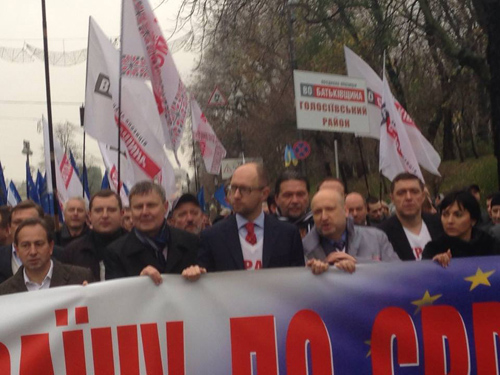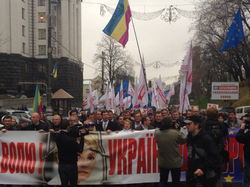 Під Верховною Радою розпочався багатотисячний мітинг прихильників опозиції. У акції беруть участь понад 10 тисяч людей. Сьогодні парламент розглядатиме закони, які можуть остаточно гарантувати підписання Україною Угоди про Асоціацію з ЄС. Перед цим учасники мітингу пройшли ходою центром Києва. Очолювали колону голова Політради ВО «Батьківщина», голова фракції «Батьківщина» Арсеній Яценюк, керівник Центрального штабу партії «Батьківщина» Олександр Турчинов та народні депутати фракції.