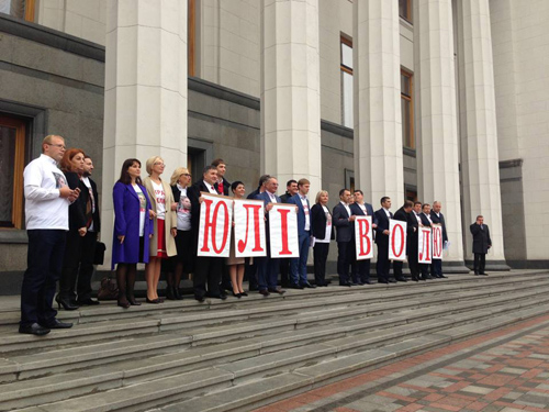 На паркані біля Верховної Ради учасники мітингу повісили плакат «Юлі – Волю! Україну – до Євросоюзу!». Народні депутати оголосили, що прямують до парламенту, де розглядатимуться закони щодо звільнення Юлії Тимошенко та щодо підписання Україною Угоди про Асоціацію з ЄС.