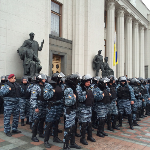 Будівля Верховної Ради оточена по периметру спецпідрозділами міліції у повному бойовому обмундируванні.