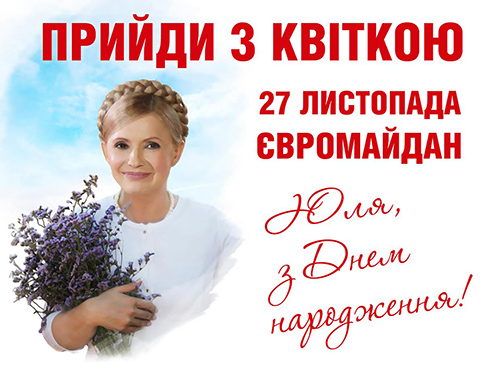 "Батьківщина" пропонує відзначити День народження лідера партії Юлії Тимошенко флеш-мобом "Прийди з квіткою". Відповідна листівка упродовж цілого дня поширюється у соціальних мережах. У середу, 27 листопада, партійці пропонують людям вийти на Євромайдан з квіткою і подарувати її будь-якій людині. "Юлія Володимирівна зустрічає за гратами свій день народження вже третій рік поспіль. Їй буде надзвичайно приємно дізнатися, що в цей день люди даруватимуть одне одному красиві квіти", - зазначили в прес-службі "Батьківщини".