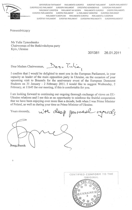 На адресу Юлії Тимошенко надійшов факс від президента Європейського парламенту Єжи Бузека, в якому європейський політик засвідчив «глибоку особисту повагу» до голови партії "Батьківщина" та письмово підтвердив запрошення зустрітися з нею 2 лютого у Брюсселі. «Шановна пані Голово! Дорога Юлія!, - пише пан Бузек. - Хочу підтвердити, що я буду радий зустрітися з Вами як з лідером найбільшої опозиційної партії в Україні – у Європейському Парламенті під час Вашого візиту до Брюсселя з нагоди відзначення річниці заснування асоціації Європейських студентів-демократів 31 січня - 2 лютого 2011 року. Я пропоную, якщо Вам зручно, зустрітися у середу, 2 лютого, об 11:45. Я сподіваюся на продовження нашого обміну думками про відносини між Україною та ЄС, що я розглядаю, як можливість посилити продуктивну співпрацю, яку ми із задоволенням підтримуємо протягом більш як десятиліття, включаючи і той час, коли я був Прем'єр-міністром Польщі, і коли Ви були Прем'єр-міністром України. Щиро Ваш, з глибокою особистою повагою».