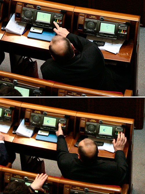 Під час сьогоднішнього засідання Верховної Ради член Партії регіонів Микола Демянко порушував принцип особистого голосування, натискаючи кнопку за себе та за свою колегу Олену Бондаренко.
