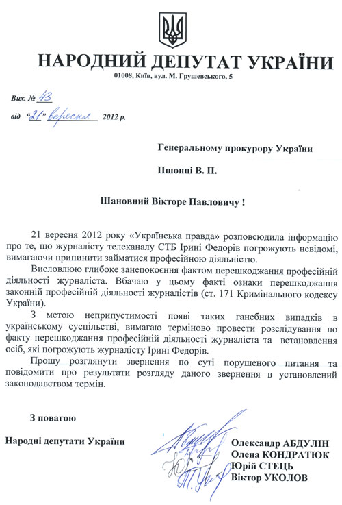 Народні депутати від опозиції – члени комітету Верховної Ради з питань свободи слова та інформації вимагають від Генерального прокурора розслідувати погрози журналісту Ірині Федорів. Відповідний запит підписали Олександр Абдуллін, Олена Кондратюк, Юрій Стець та Віктор Уколов. Депутати зазначають, що сьогодні у ЗМІ з’явилася інформація про те, що невідомі погрожують журналісту телеканалу СТБ Ірині Федорів, вимагаючи припинити займатися професійною діяльністю. «Висловлюю глибоке занепокоєння фактом перешкоджання професійній діяльності журналіста. Вбачаю у цьому факті ознаки перешкоджання законній професійній діяльності журналіста (ст. 171 Кримінального кодексу України)», - йдеться у зверненні до Генпрокурора Віктора Пшонки. «З метою неприпустимості появи таких ганебних випадків в українському суспільстві, вимагаю терміново провести розслідування по факту перешкоджання професійній діяльності журналіста та встановлення осіб, які погрожують журналісту Ірині Федорів», - наголошується у документі.